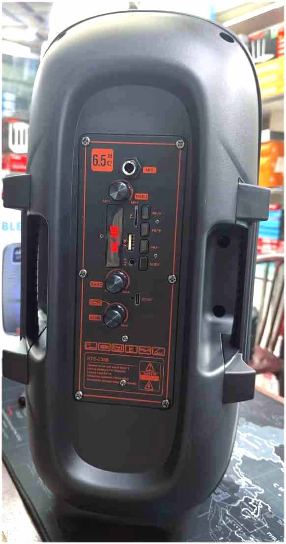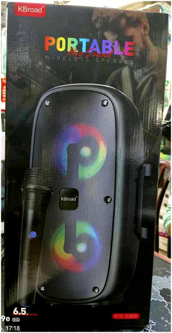 Kboard KTS-2388 is a powerful portable speaker featuring dual 6.5-inch drivers for rich, clear sound. Enjoy 3–4 hours of continuous music playback with adjustable Bass, Treble, and Master Volume controls to match your mood. It supports AUX, FM, TF Card, and USB input, along with a Type-C charging port for fast and easy charging. The built-in RGB lighting adds a stylish touch, making it perfect for parties, outdoor use, or home entertainment. Made in China.